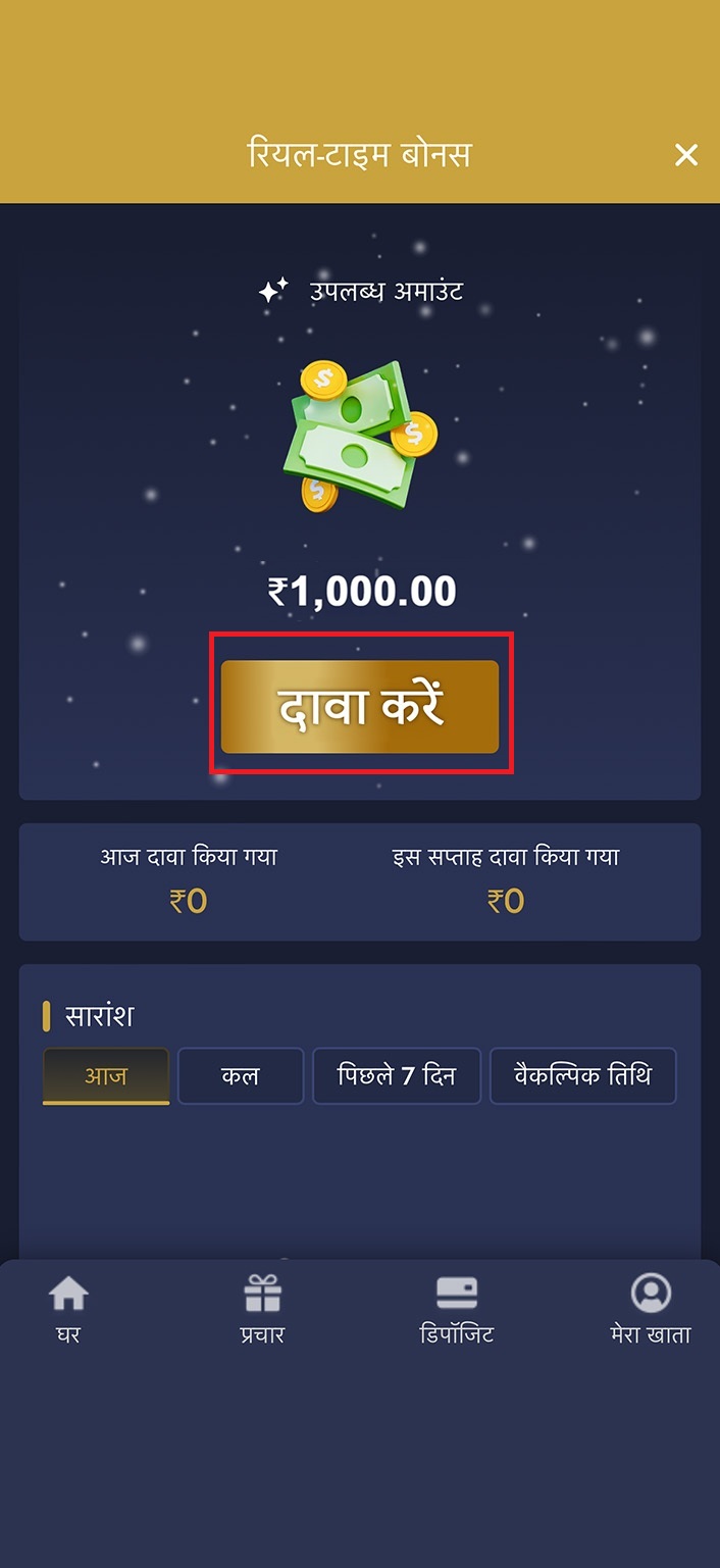 4. अपना बोनस रिडीम करने के लिए रिबेट या रेस्क्यू बोनस टैब में अवेलेबल अमाउंट के अंदर क्लेम पर क्लिक करें। होमपेज पर वापस जाएं और पेज रिफ्रेश करके देखें कि बोनस क्रेडिट हुआ है या नहीं।