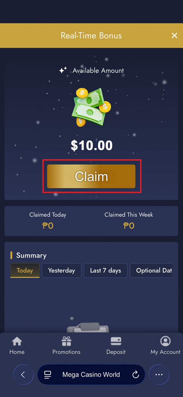 3. Click the main wallet tab and look for Real-Time Bonus Icon. Click to proceed.