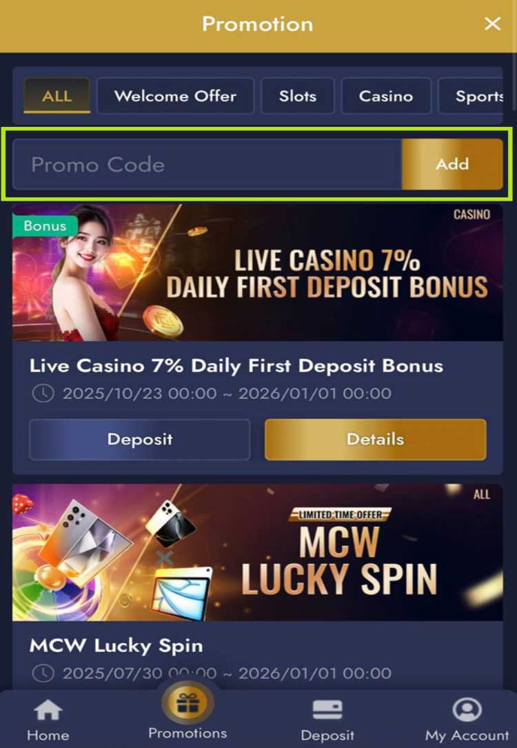 1. Copy your promo code received from our official channels (Promotion Page, TG, Facebook, Email, etc.)