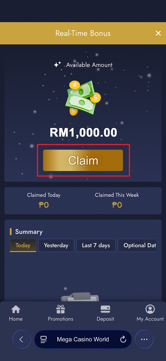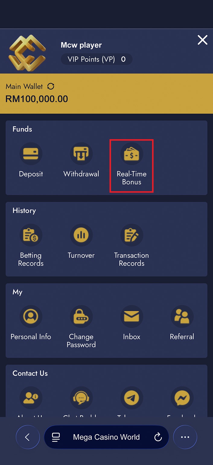 3. Click the main wallet tab and look for Real-Time Bonus Icon. Click to proceed.