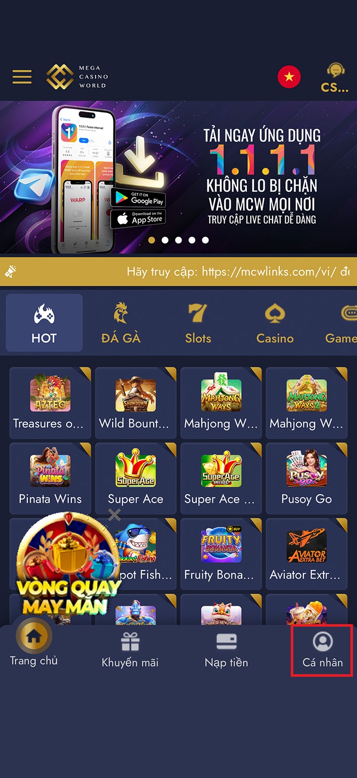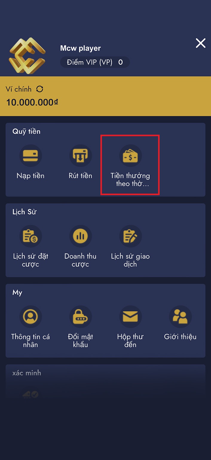 3. Chọn tab Ví chính, tìm biểu tượng Thưởng Thời Gian Thực và nhấp để tiếp tục.