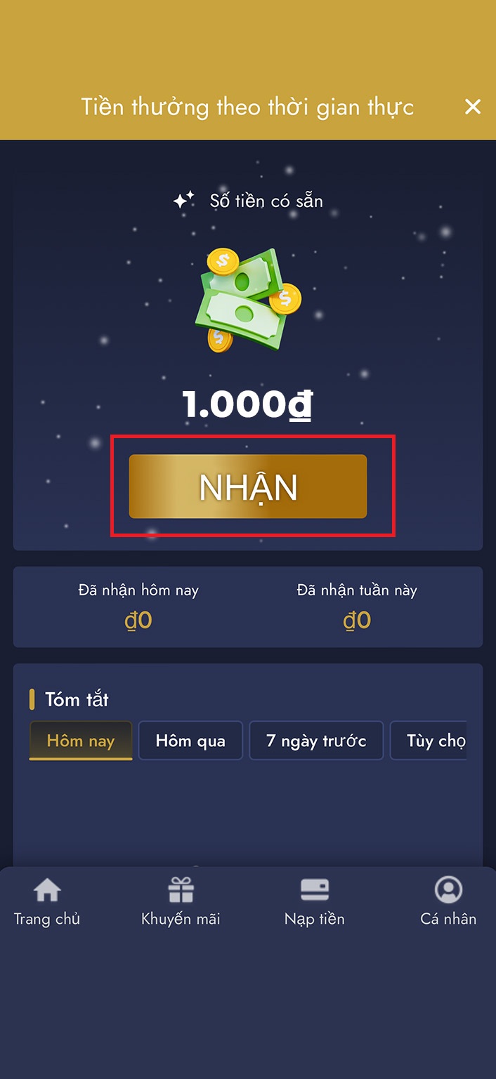 4. Nhấn “Nhận tiền” tại mục “Số tiền khả dụng” trong tab “Hoàn Trả” hoặc “Hoàn tiền” để nhận. Quay lại trang chủ và làm mới trang để kiểm tra xem tiền hoàn trả đã được cộng chưa.